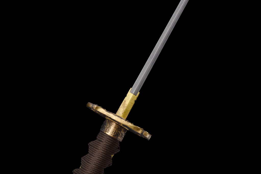 Handle (Tsuka 柄): Wrapped in brown cord with a golden underlayer over ray skin, the tsuka ensures grip, elegance, and durability.