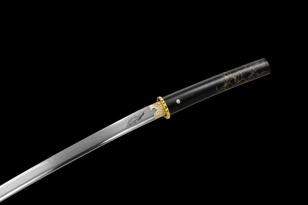 The fittings are forged from solid copper, enriched with golden detailing inspired by classical Japanese motifs. The tsuba, fuchi, and kashira all feature hand-engraved patterns, giving the sword a noble and unmistakably authentic aura. The scabbard (saya) is finished in a striking black–gold cracked lacquer style, reminiscent of ancient kintsugi, symbolizing resilience and beauty reborn.